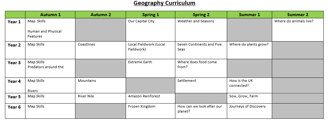 - Develop core geographical skills – map reading, fieldwork, enquiry, and geographical vocabulary – revisited each year to build progression.