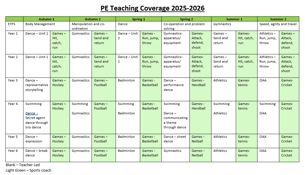 As part of our PE curriculum, lessons are taught by teachers and also coaching staff from Sport’s Plus. PE lessons are taught twice weekly and skills are taught through fundamental movements in dance, gymnastics and games in KS1 and dance, games, gymnastics, athletics and outdoor adventure in KS2.
